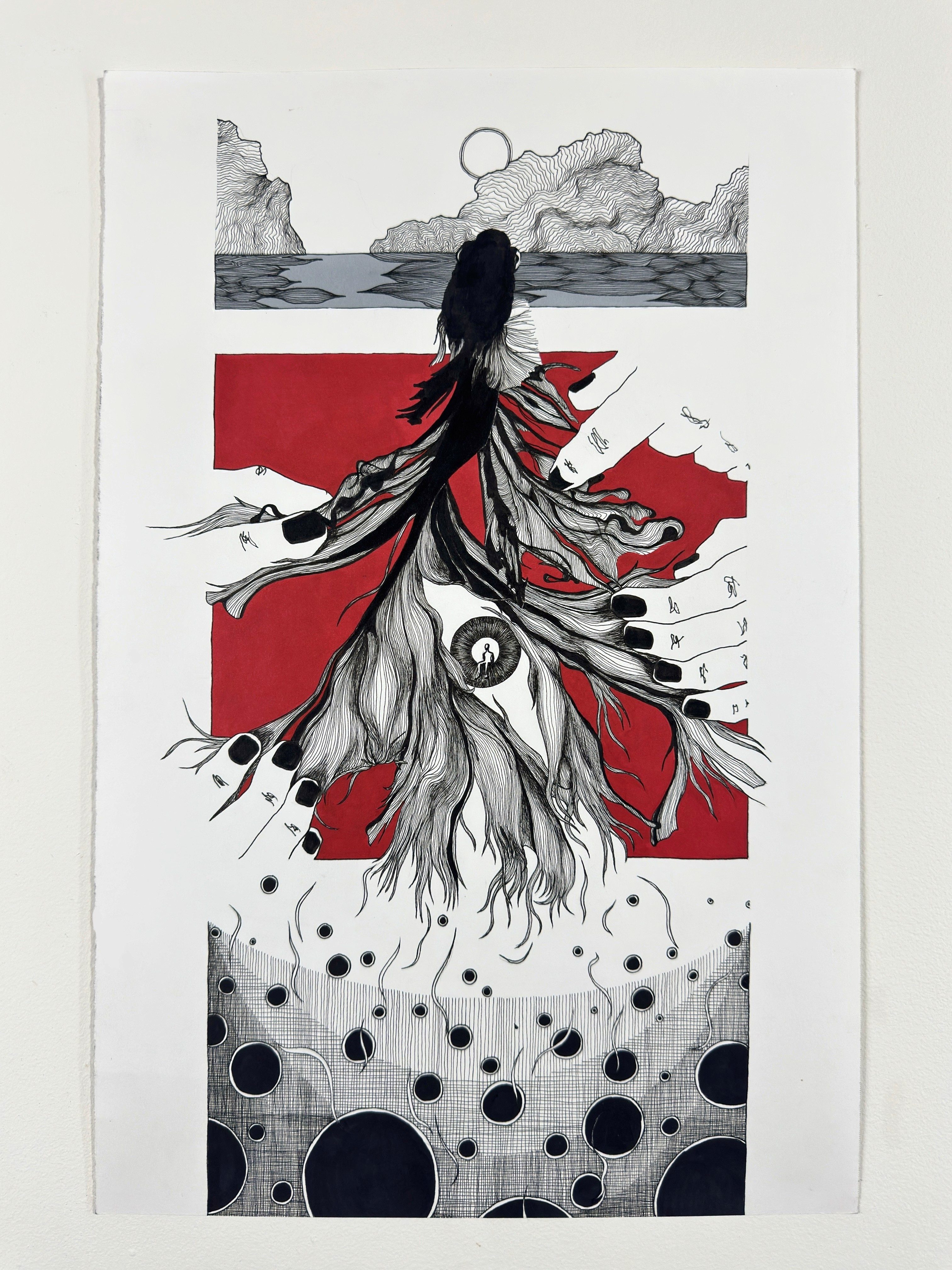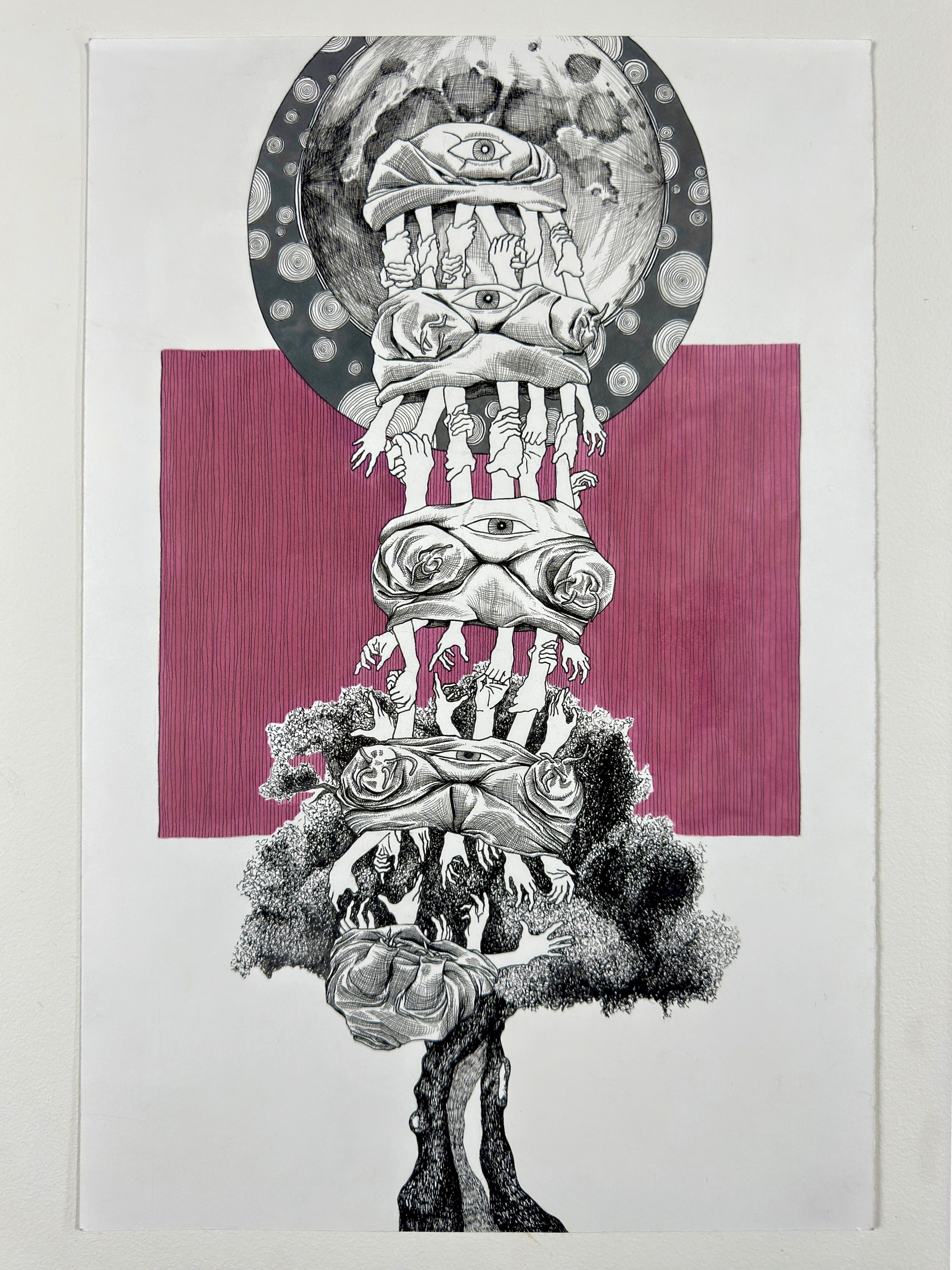 This artwork depicts myself as a tardigrade within a backdrop that extreme conditions (represented by the moon/space) and tranquil conditions (represented by a tree/Earth). The desperation for survival is conveyed through outstretched arms, while the tardigrade’s wrinkles and drooping l limb represent my own experience of succumbing to environmental shifts.
