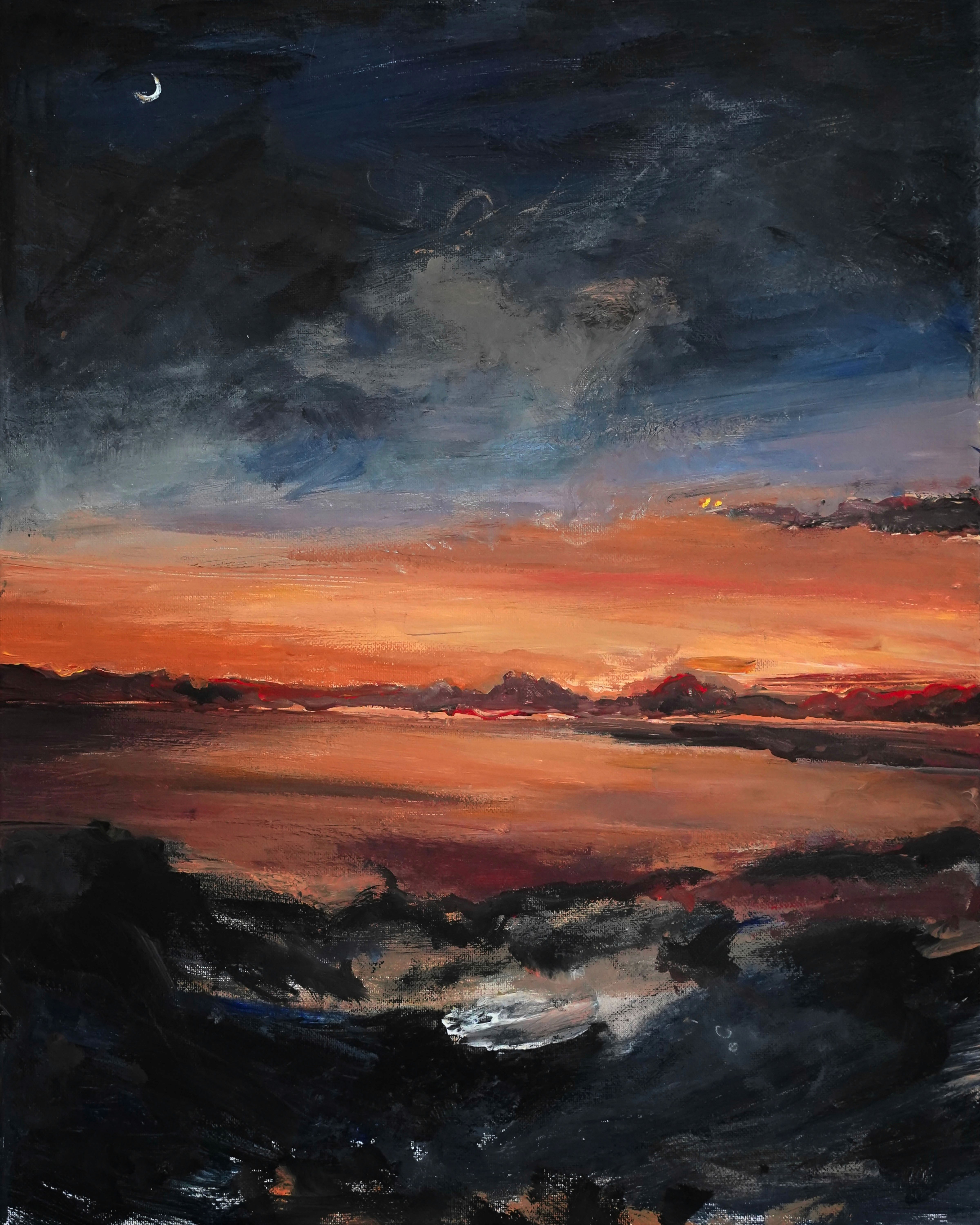 The contrast of light and dark not only reflects her memories of what she saw during her travels while painting but also invites the viewer to experience in the present moment the emotions she felt during those fleeting moments of creation, which have now become memories themselves.
