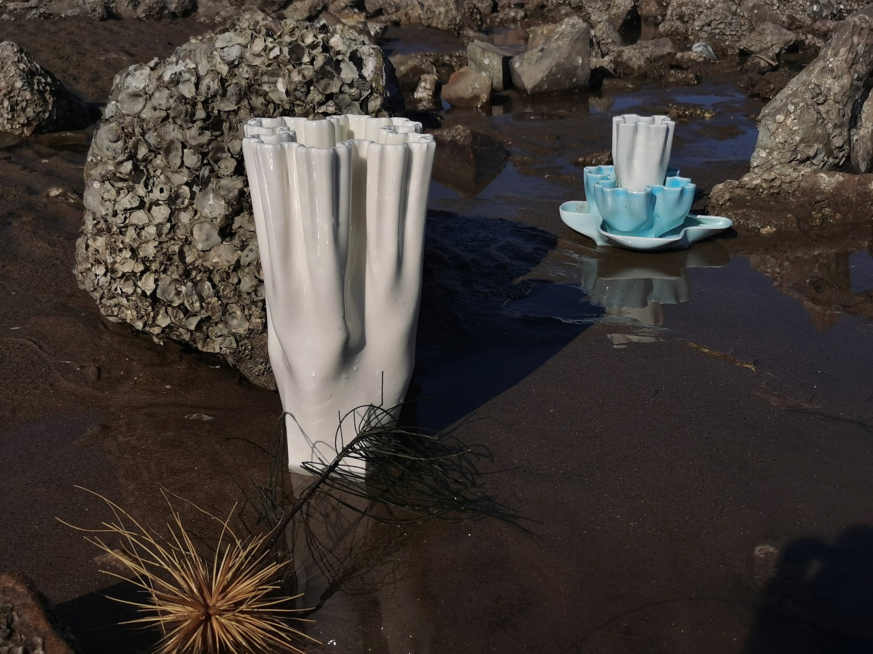 The resulting ceramic set includes a plate (127x127x17 mm), a bowl (100x100x58 mm), a cup (100x100x58 mm), and a vase (150x150x270 mm). Each object represents a distinct manifestation of identity, emerging from the same origin but expanding into diverse forms. These pieces highlight the self-exploration inherent in the multiplicity of identities within varying "containers."